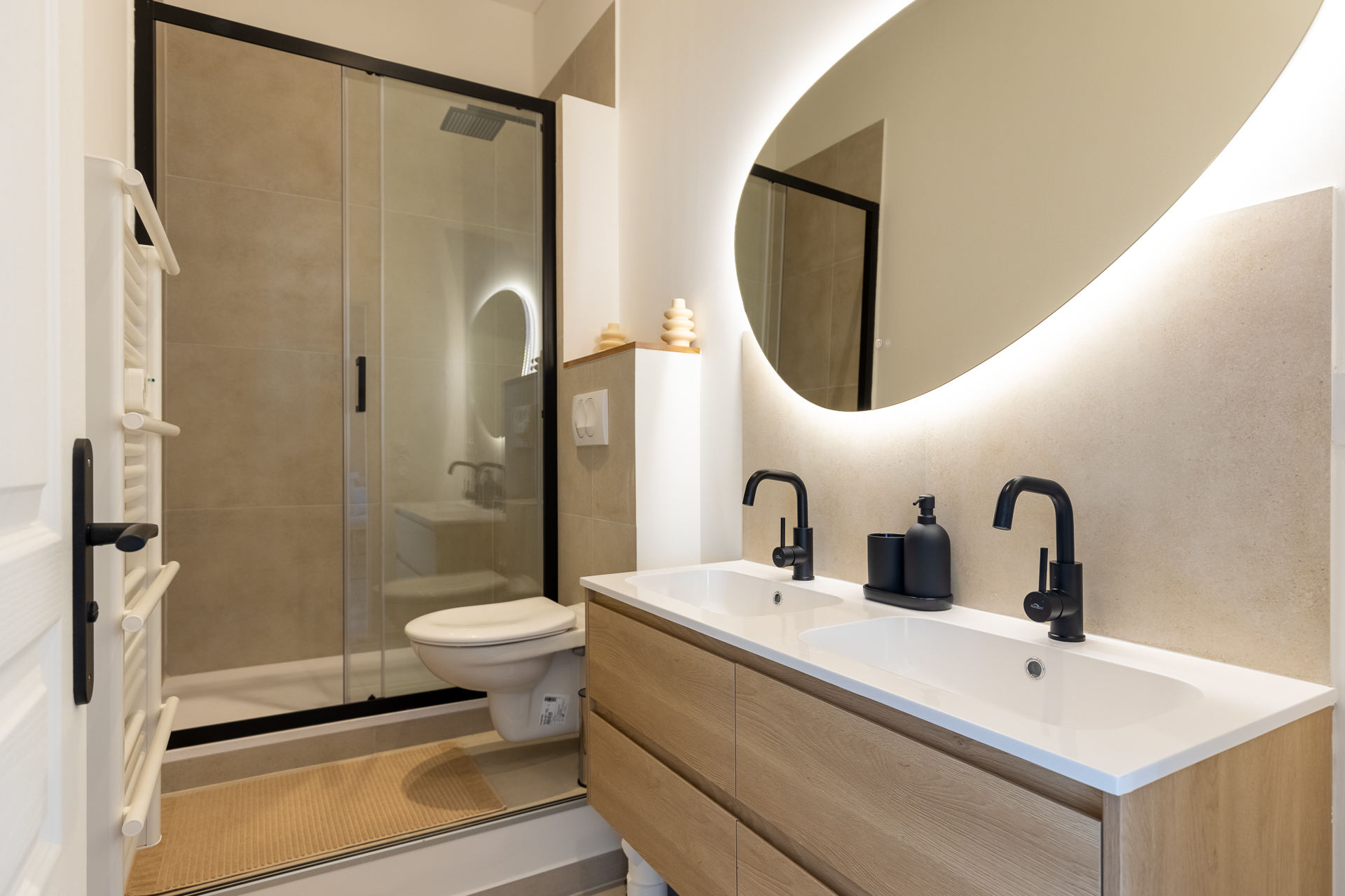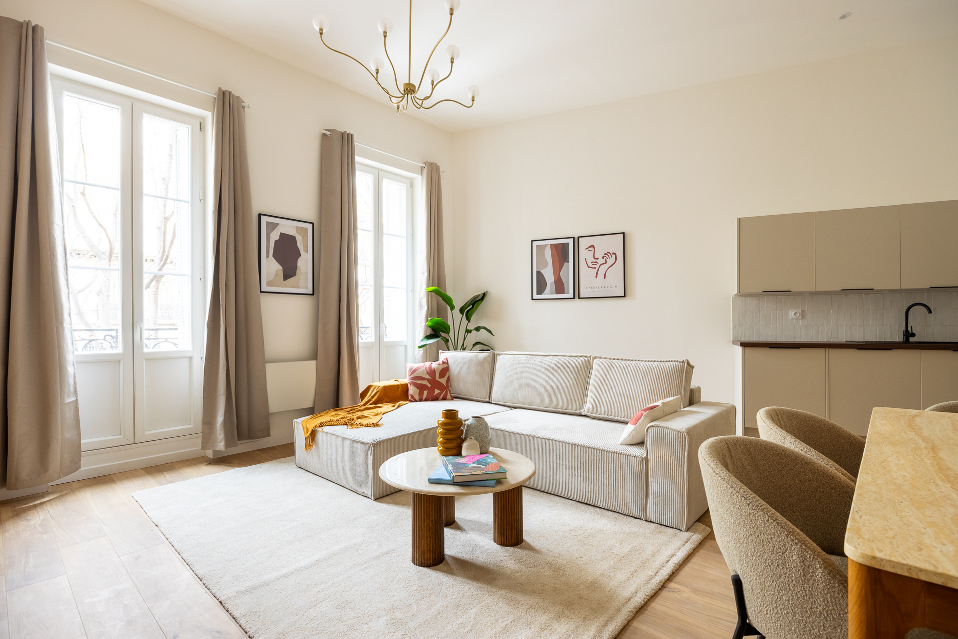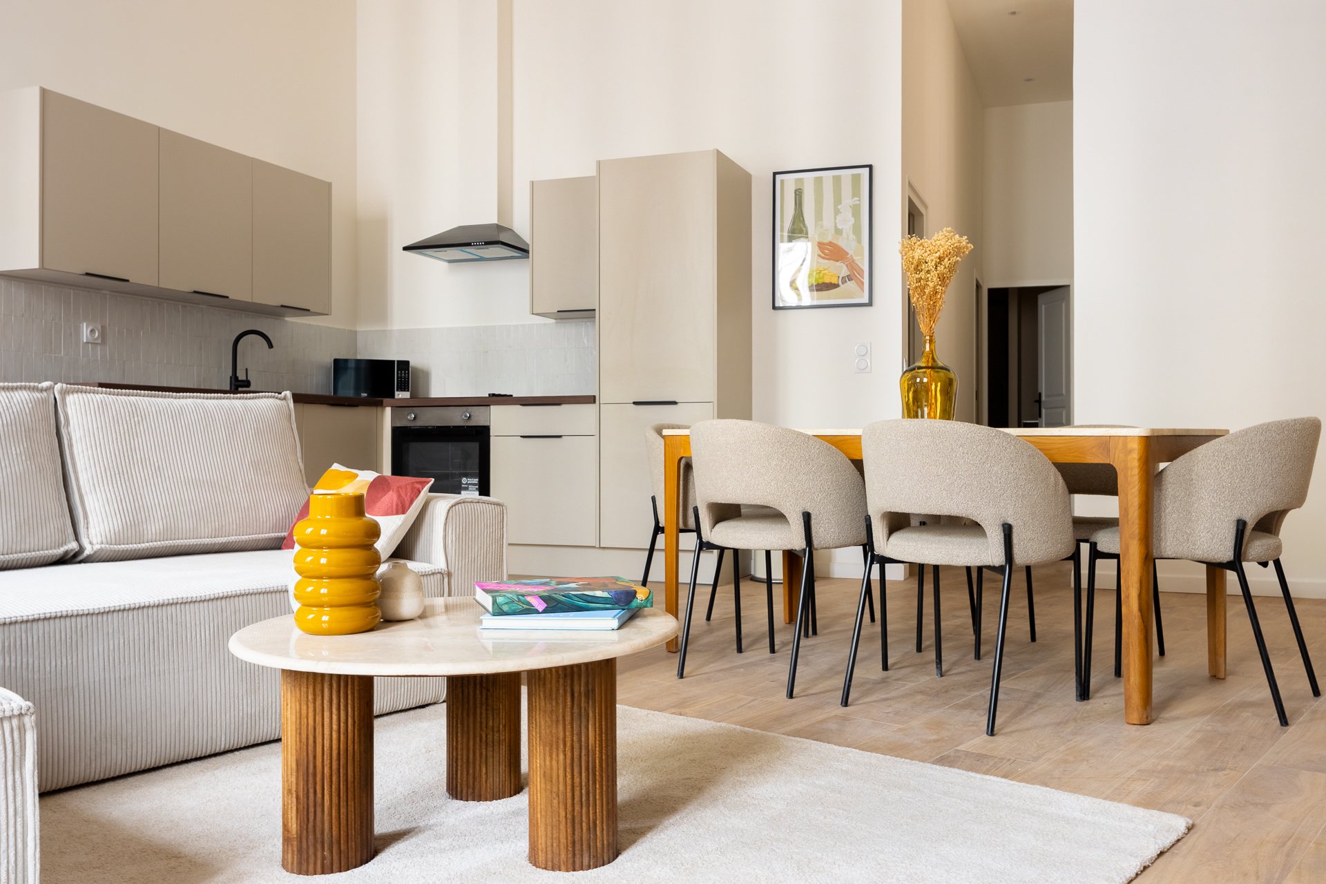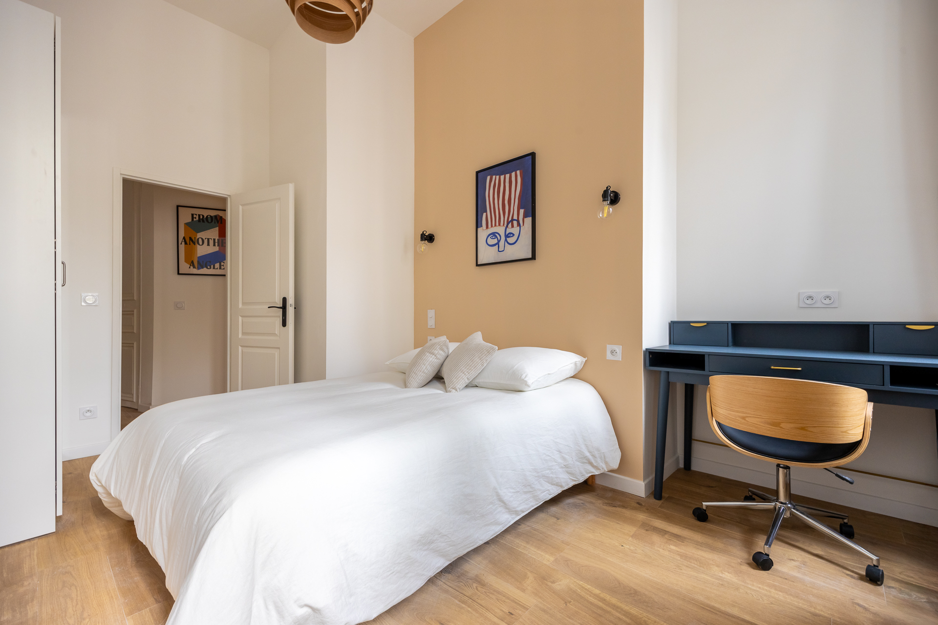 Notre architecte d’intérieur a totalement repensé le plateau pour créer une véritable vie en communauté, sans compromis sur le confort individuel. Chaque chambre dispose d’un espace bureau, les pièces d’eau ont été doublées, et les parties communes pensées comme un lieu de vie chaleureux, avec cuisine haut de gamme, coin repas et espace détente.